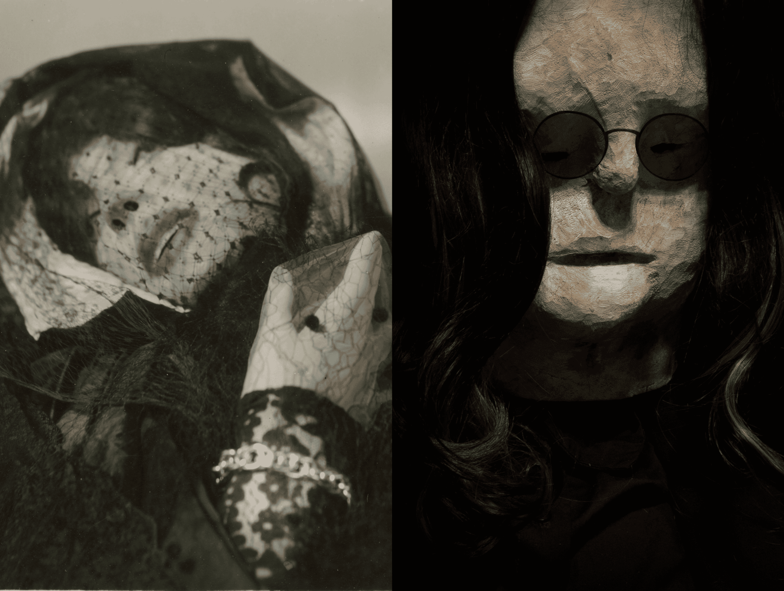Abb.: Links: Pierre Molinier, La poupée, 1956-57. Copyright the artist, Courtesy of Galerie Christophe Gaillard, Paris. Rechts: Angélique Aubrit & Ludovic Beillard, Une solitude vraiment terrible (Clod), 2025. Courtesy of the artists und Wouters Gallery, Brüssel.